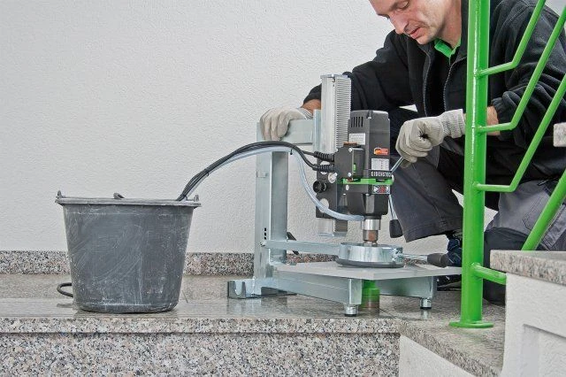 Tegelboormachine met instelbaar regelbaar toerental voor het watergekoeld boren in tegels, keramisch plaatmateriaal, glas en natuursteen. De machine is uitgerust met een geïntegreerde waterpomp en een Y-voet, waarmee zonder opvangbak direct in de vloer en op grotere platen geboord kan worden. Met thermische- en overspanningsbeveiliging, mechanische slipkoppeling, PRCD schakelaar en extra drukring met spatwaterbescherming. Exclusief standaard en boorkronen.