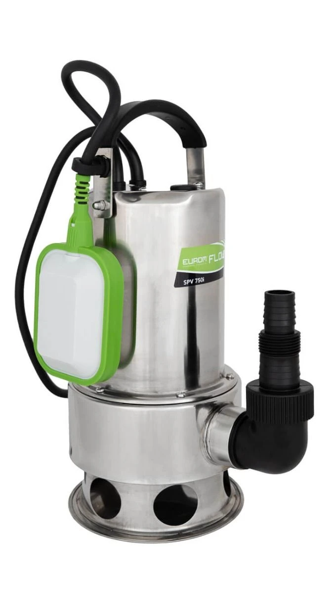De SPV750i dompelpomp is een roestvrijstalen Eurom dompelpomp met een krachtig motorvermogen van 750 Watt en een capaciteit van 210 liter per minuut. Is uw kelder onder water gelopen, uw terras overstroomd of moet uw zwembad leeg worden gepompt, dan brengt een Eurom dompelpomp uitkomst.