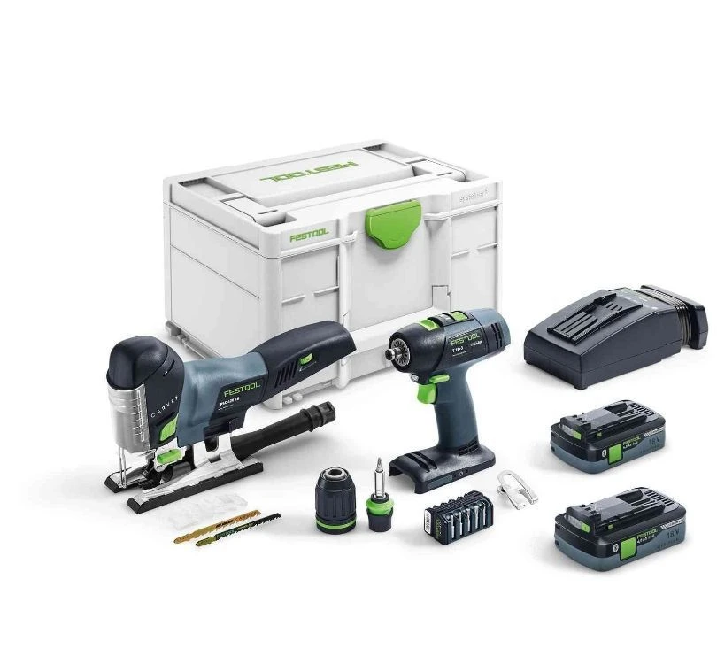 Accuschroefboormachine T18+3, pendeldecoupeerzaag PSC 420 EB, 2 x accu BP 18 Li 4,0 HPC-ASI, snellader TCL 6, CENTROTEC gereedschapshouder, CENTROTEC magnetische bithouder BH 60 CE, snelspanboorkop FastFix 13 mm, bit-assortiment twinBOX BB-MIX, riemclip, 2 x zaagbladen (1x fijngetand zaagblad/1x universeel blad), splinterbeveiliging, Systainer³ SYS3 M 137, in doos.