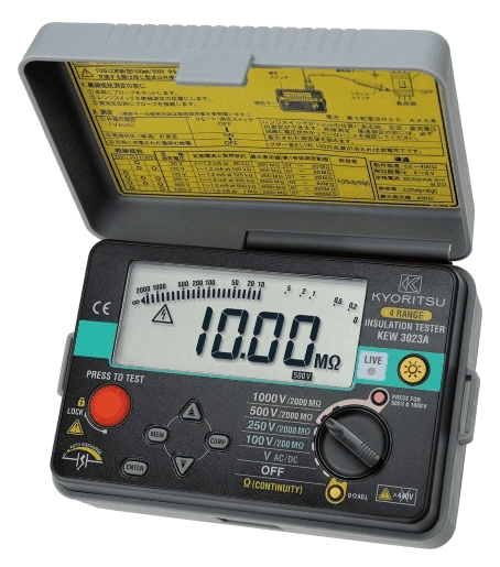 De Kyoritsu 3023A is een digitale Isolatieweerstandmeter met testspanningen van 100V, 250V, 500V en 1000V. Verder beschikt de meter over een AC/DC spanningsmeting en een 200mA continuïteitstest. Deze meter geeft een zeer snel resultaat (weergave binnen 1 seconde).