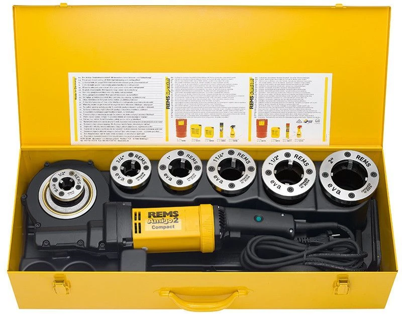 REMS Amigo 2 Compact Set R 1/2 – 3/4 – 1 – 1 1/4 – 1 1/2 – 2 Elektrisch Draadsnij-ijzer met snelwisselsnijkoppen 540024
