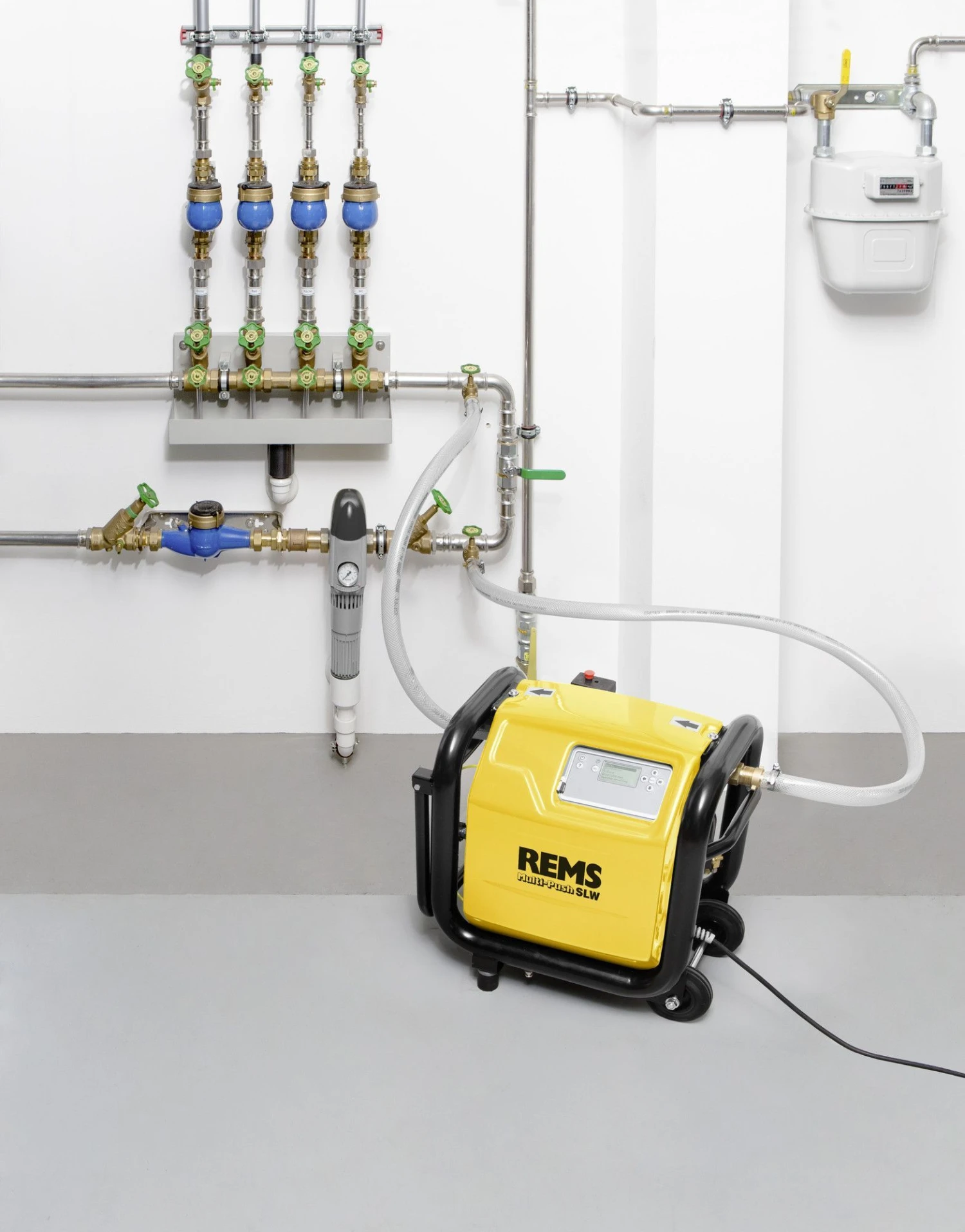 1 stuk hogedrukslang ½”, 1,5 m lang, met slangschroefverbindingen ½”, voor de druk- en dichtheidstest van leidingsystemen en reservoirs met water.