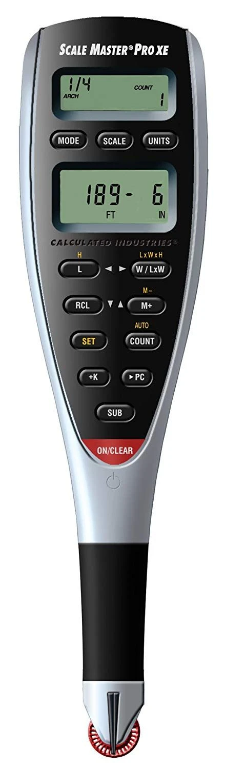 De Scale Master® Pro XE is een digitale curvimeter met data output voor professionals in de bouw, engineering en constructie. Verkrijg snel nauwkeurige lineaire, oppervlakte en volume take-offs van blauwdrukken, tekeningen en kaarten. Het toestel beschikt over 91 voorgeprogrammeerde schalen, 10 handmatig aan te passen schalen en 2 ingebouwde herinneringen. Een Lock-schakelaar voorkomt dat per ongeluk van schaal of mode wordt gewisseld. De Scale Master Pro XE is met zijn nieuwe ergonomische design en twee LCD schermen een ideaal hulpmiddel voor het opstellen van offertes en ramingen in het veld of op kantoor.